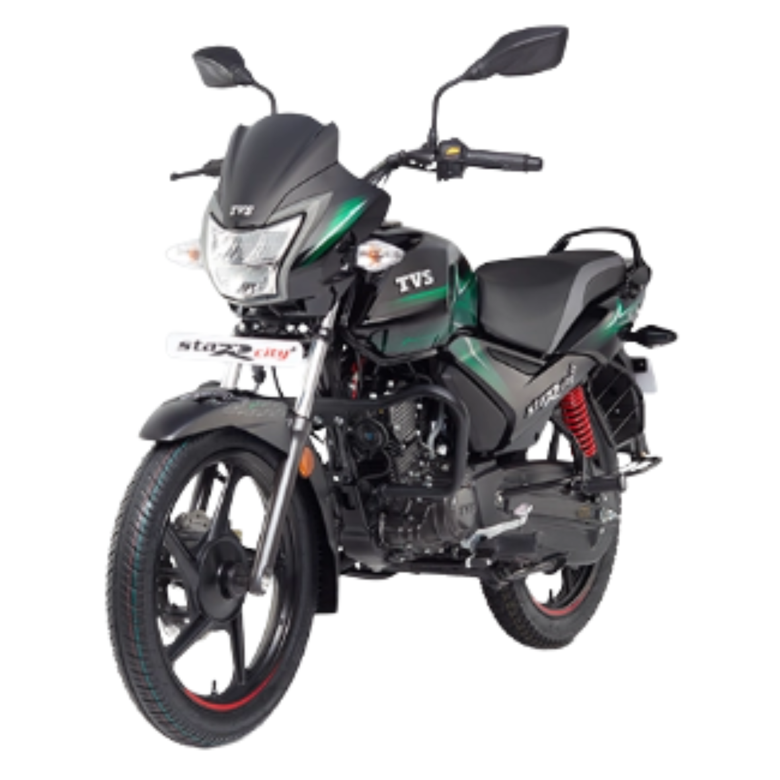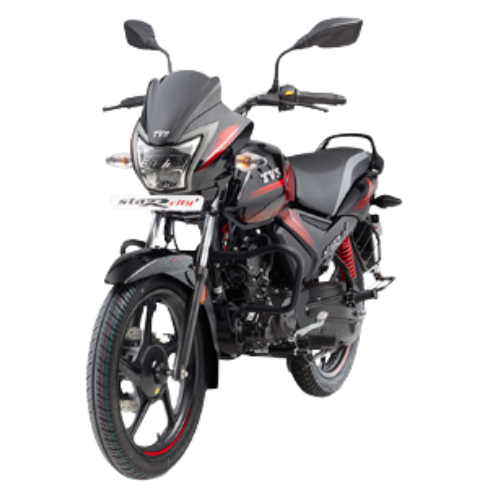 The TVS Star City+ Dual Tone Disc is a commuter motorcycle featuring a 109.7cc BS6-compliant, ET-Fi engine, a 240mm front disc brake with Sync Brake Technology (SBT), and 5-step adjustable rear shock absorbers for a comfortable ride. It offers modern features like an LED headlamp, semi-digital instrument console, alloy wheels, and a USB mobile charger, providing a blend of style, efficiency, and practicality for daily use.